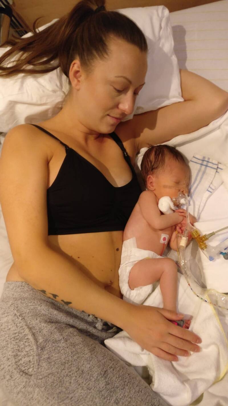Maandagochtend zouden we ingeleid worden. Sochtends half 6 bellen en als er niks tussen kwam half 7 in het ziekenhuis zijn. Maar Ivy wilde alleen graag zelf bepalen wanneer zij kwam. Toen wij de zondag avond ervoor naar bed gingen, heeft Ivy zeker van 10 tot 2 lopen rommelen, elke 15 minuten heb ik geplast, heb geen oog dicht gedaan.. tot ik met mijn warrige hoofd besefte dat het niet Ivy was die rommelde, en ik eigenlijk niet de hele tijd moest plassen, maar dat het gewoon de weeën waren die op gang waren gekomen. Ivm mijn vorige bevalling die zó snel ging wilde ik niet meer wachten dus ik belde het ziekenhuis 02.15 en we konden meteen langs komen. Ze hadden een kamer met bad voor mij vrij gemaakt! Super fijn want dit wilde ik graag maar ik had dit niet meer aangegeven toen ik ze opbelde. Ik ging aan de ctg en kreeg een inwendig onderzoek, de ctg was mooi en ik bleek op 4 cm ontsluiting te zitten. Ik had al om de 5 minuten weeën maar kon deze gewoon nog goed aan. Ik besloot in bad te gaan en hier heb ik nog even lekker kunnen ontspannen. Na enige tijd uit bad gegaan, om nog even een broodje te eten want we waren 02.15 van huis weg gegaan, en om te bevallen mag je toch wel een goede bodem hebben. Daarna ben ik op bed blijven liggen en kreeg ik nog een inwendig onderzoek waaruit bleek dat ik op 5 cm zat. Er kwam alleen meer tijd tussen de weeën te zitten.. maar de weeën waren wel al een stuk pijnlijker. Omdat er meer tijd tussen de weeën kwam te zitten en ik toch wel erg moe was omdat ik niet geslapen had, hebben we allebei tussen de weeën door nog een beetje kunnen weg dutten. Maar als ik een wee kreeg had ik Jim al nodig om hem weg te puffen. Misschien een uurtje daarna kreeg ik weer een inwendig onderzoek om te kijken of het al wat vorderde, maar ik bleek helaas nog steeds op 5 cm te zitten, dus stelde ze mij voor om een kleine hoeveelheid weeën opwekkers via een infuus toe te dienen en mijn vliezen werden nog gebroken, en via ditzelfde infuus kon ik ook een pompje met milde pijnstilling toegediend krijgen. Na enige twijfel of, en welke pijnstilling ik zou nemen (vorige keer was ik te laat om het nog te krijgen dus moest rekening houden dat ik dit beter op tijd kon beslissen deze keer) besloot ik voor de weeën opwekkers en het pompje via infuus te gaan ondanks mijn enorme angst voor prikken. Het infuus werd alleen helemaal verkeerd geprikt en dit deed ontzettend pijn, alsof er een satéstokje in mn arm werd geprikt, wat ervoor zorgde dat ik een soort paniek aanval kreeg en even nodig had om te beslissen wat ik nu wilde, ik durfde niet meer en ging liever nog even zelf mijn inmiddels erg pijnlijke weeën te lijf. Tóch daarna besloten om het weer te proberen, omdat de weeën steeds erger werden. Dit ging gelukkig goed, maar de weeën werden ook plots weer nóg sterker en kwamen sneller dus alleen de pijnstilling werd toegediend en met de weeën opwekkers wachtte we weer even. Vanaf dit moment ging het weer als vorige keer enorm snel, de ene pijnlijke wee na de ander. Ik had gelukkig het pompje waar ik een stonede garnaal van was geworden, en waar de harde kantjes van de weeën mee af schijnen te gaan.. Nou ik weet niet of het dat deed want ik kon de weeën helemaal niet meer aan, ik kon ze niet meer wegpuffen en kon t alleen maar uit schreeuwen in paniek. Het leek weer een weeën storm, en ik had al pers drang. Ik bleek na nog een inwendig onderzoek (wat oh zo pijnlijk is als je weeën hebt) toch ineens al snel op 9 cm te zitten, maar dus geen 10 waardoor ik nog niet mocht persen, alleen probeer dat maar is tegen te gaan als je lichaam dat aangeeft!! Er bleek nog een klein randje te zitten waardoor ik niet op de 10 cm kwam en dit heeft best wel even aangehouden. Ze hebben geprobeerd zelf die 10 cm te creëeren, wat ook heel pijnlijk was, het leek wel bijna te werken maar het lukte toch maar niet en ik kon het vechten tegen het persen echt niet meer ophouden. Op dat moment ben ik gecatheteriseerd, om mijn blaas leeg te halen, om te kijken of dit wél werkte om het randje weg te krijgen. Gelukkig had ik eindelijk toestemming om er voor te gaan, en ik kon eindelijk wat doen met die enorm pijnlijke, en snelle weeën, persen. Alleen het lukte niet ik kreeg haar er niet uit.. Na wat hulp van de verloskundige kwam daar wel eindelijk het hoofdje.. Ik kon haar hoofdje zelf zien maar mijn persdrang stopte, en ik kon geen krachtige pers meer geven voor haar lichaampje. Er werd alweer op de bel geslagen en er kwamen alweer andere mensen bij.. Ik zag Jim al met zijn handen in zijn haren even wegdraaien en de moed zakte ons alweer in de schoenen.. Omdat Ivy haar lichaampje er niet uit kwam werden ineens mijn benen in mijn nek geduwd en weer gestrekt, en opnieuw, en opnieuw terwijl ik met man en macht mijn laatste pers probeerde te geven en ik ook weer expressie kreeg, het er uit duwen van de baby, omdat ze klem zat met haar schouder. 10.41 uur daar kwam ze eindelijk... Ze werd op mijn borst gelegd, ze was rustig, maar ze ademde, ze bewoog, er kwam een piepje uit, ons kindje maakte geluid, iets wat wij nog nooit gehoord hadden.. Ik zag meteen dat dit anders was als bij Aiden. Ik was in shock en ondanks dat ik natuurlijk super blij was met tekenen dat het goed leek te gaan voelde ik weinig. Ze heeft een tijdje op mijn borst gelegen, heeft al snel aan de borst gelegen en in de tussentijd werd ik nog gehecht omdat ik uitgescheurd was.... Ons meisje was gewoon bijna 7 pond, een beste aanslag op mijn lichaam. En een nog groter trauma dan mijn vorige bevalling. Zowel ik als Jim denken ook echt na 2 van deze bevallingen dat we dit echt niet meer aandurven.. Nadat ik gehecht was en van bed mocht, hebben we gedoucht, gegeten, en Ivy werd nog nagekeken. Alles was goed, en ik hoefde alleen nog te plassen voor we naar huis mochten! 02.30 waren we in het ziekenhuis en 14.30 mochten wij als gezin naar huis, wat een ongelovelijk raar en onwerkelijk gevoel.. Maandag had ik er nog moeite mee te geloven dat ze