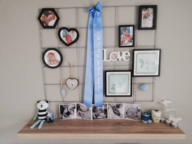 Ik had het in mijn hoofd zitten om pas rond week 20 de spulletjes uit Aiden zijn kamertje een nieuw plekje te geven, de kleertjes uit te zoeken, kijken voor wat meiden decoratie etc. Alle meubels en nodige spullen hebben we natuurlijk al. Maar er komt een moment dat Aiden zijn kamertje, '...' haar kamertje wordt (kan het niet vaak genoeg zeggen en denken... 'als het allemaal goed gaat'). Nou zullen het de hormonen ook wel zijn maar ook emotioneel was ik er vorige week toch al wel klaar voor om de kleertjes uit te zoeken. Al het blauwe in een zak naar een nieuwe bestemming. De commode was een soort gedenk tafeltje geworden voor Aiden en al die spulletjes heb ik gisteren een heel mooi plekje gegeven boven ons bed. Een mooie doos met zijn spullen naar onze kamer. Ik wil het absoluut niet weg stoppen, hij blijft gewoon bij ons. Het is wel heel raar en dubbel.. Een beetje apart om zijn kamertje te verkassen en ruimte te maken voor een ander kindje. De gevoelens die het met zich mee brengt zullen in ieder geval vast wel weer goed zijn voor de verwerking. En het feit dat hij nu eigenlijk nog een mooier plekje heeft geeft wel weer wat troost. Ik probeer er maar niet te veel bij stil te staan.