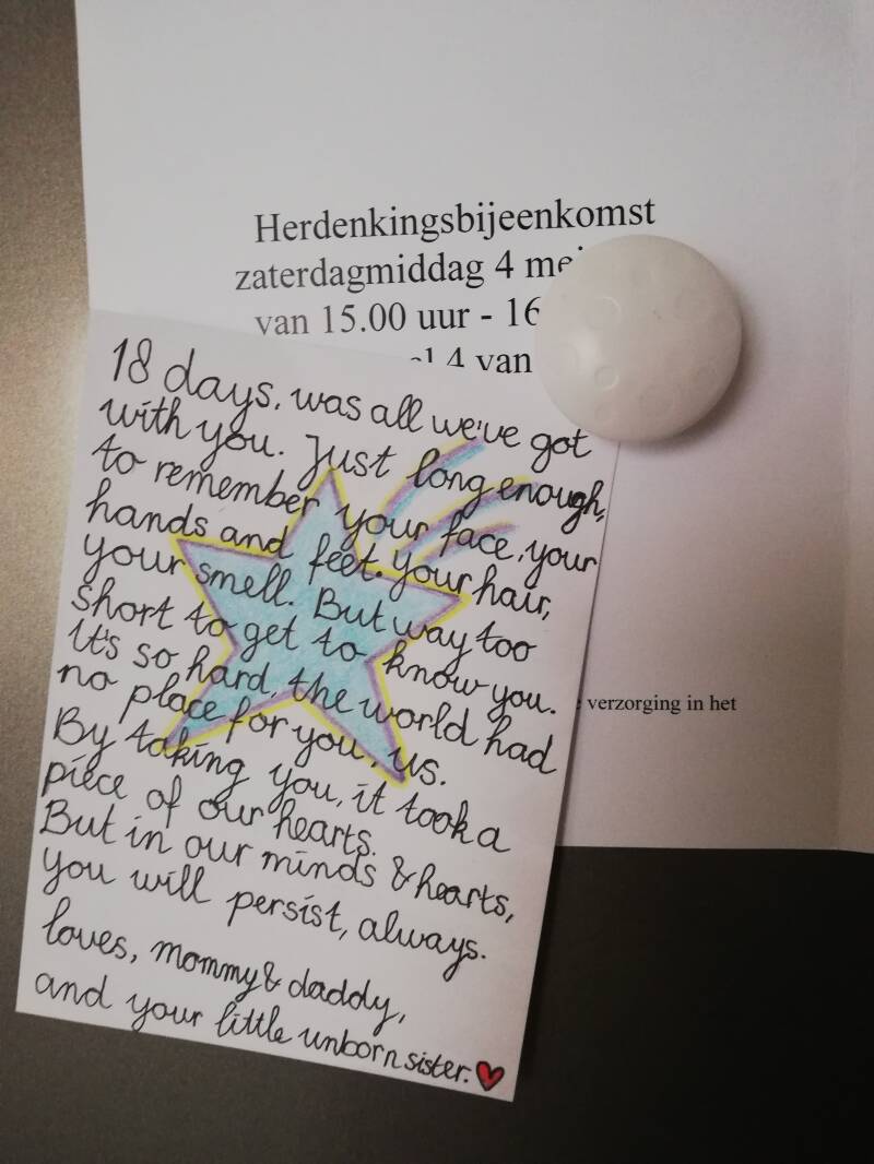 We staan op. Wat moeten papa en mama tegen elkaar zeggen? Gefeliciteerd? Vandaag is het alweer een jaar geleden dat jij in ons leven kwam. Alweer 1 jaar geleden, dat jij ons vader en moeder maakte. We hadden toen alleen echt nooit kunnen verwachten, dat ons leven nu zou zijn zoals het is. Vader en moeder, maar geen papa en mama. We hebben alle feestdagen, nu voor het eerst meegemaakt met het besef dat jij bij ons had moeten zijn. Maar jij bent niet meer bij ons, wat ons zo vreselijk verdrietig maakt.. en waar we nog steeds heel veel moeite mee hebben om dit te realiseren. Door hoe heftig het heeft moeten lopen maar ook omdat we daarnaast nog eens zwanger zijn van jouw zusje, die elk moment kan komen. We hadden het zo graag anders voor onszelf gezien, maar vooral voor jou. Ik voel me schuldig voor jou dat ik je het leven niet heb kunnen geven, dat ik je niet heb kunnen beschermen, en ergens ook dat we op jouw dag niet volledig met jou bezig kunnen zijn door dat jouw zusje elk moment kan komen. We hadden je zo graag willen leren kennen, je zien opgroeien, je dingen willen leren en je willen beschermen.. Hoe had je er nu uit gezien? Had je al gelopen? Zou je een boefie geweest zijn? Hoe was je als grote broer geweest? Had je al een paar tandjes gehad? Of een paar woordjes gezegd? We zullen het nooit weten.. Ik had ergens verwacht dat ik nog iets van je aanwezigheid gevoeld zou hebben maar dat heb ik nog niet gehad. Ik hoop het nog mee te maken en ik hoop in ieder geval dat als je nog ergens bent, dat je ons zult begrijpen in de keuzes die we hebben moeten maken, dat je alsnog onderdeel van ons gezin kunt zijn, en ik hoop dat we jouw zegen hebben met de komst van jouw zusje, die zal opgroeien met ouders die haar alles zullen vertellen over haar grote sterke broer. Ouders die jou ontzettend missen, en een leven lang zullen blijven zitten met het onmogelijke en niet te beantwoorden verlangen, naar jou. Al het verdriet wat wij voelen, is liefde die wij jou niet kunnen geven en nooit zullen kunnen geven. We missen je ventje. En het gekke is dat we iets missen wat we niet kennen.. En toch missen we je zo. Als de komst van jouw zusje niet onverwachts vandaag is, kopen we nog een speciaal voor jou uitgekozen kamerplantje, die we met een beetje van jou as willen gaan planten. En vandaag branden we sowieso een kaarsje voor jou, om jou te herdenken op je geboortedag.. We denken aan je kleine ster ππ