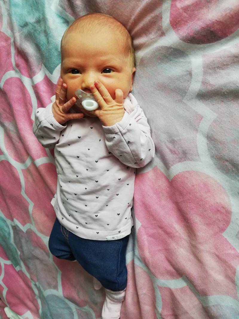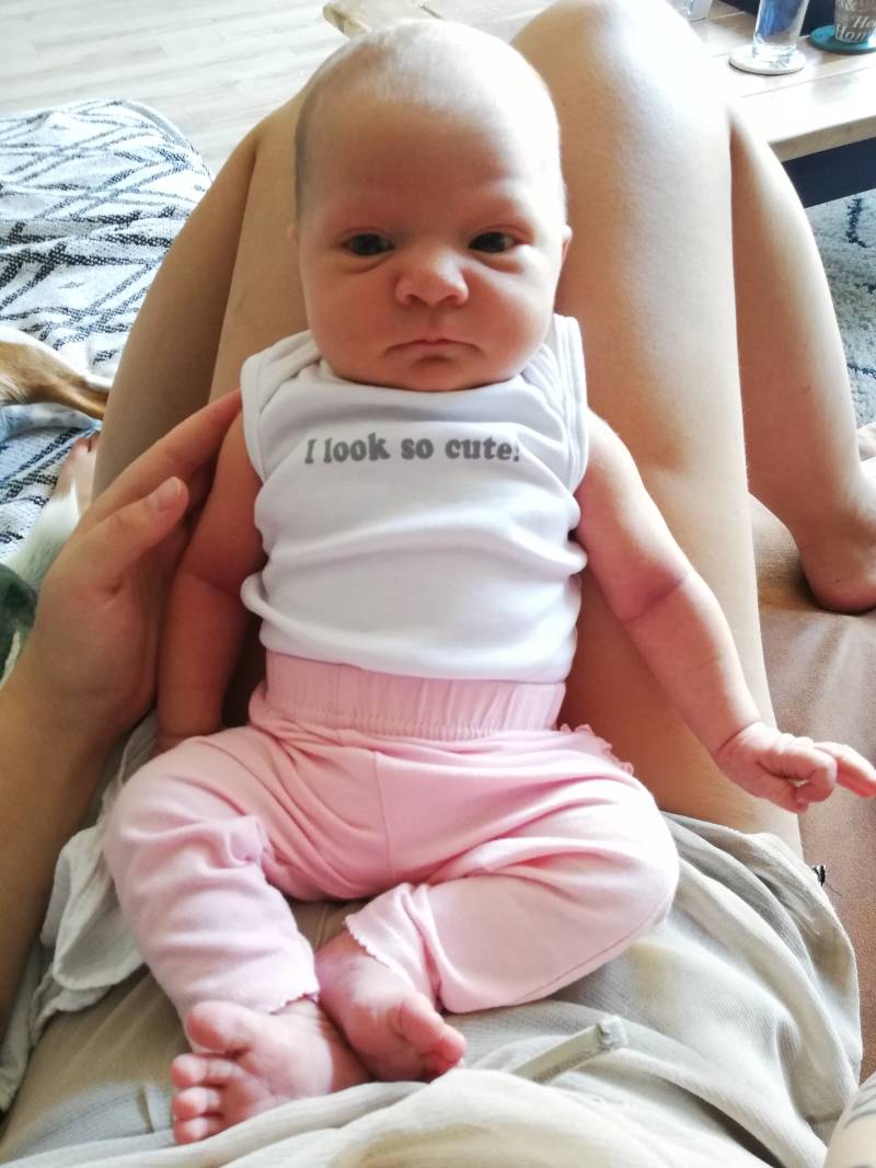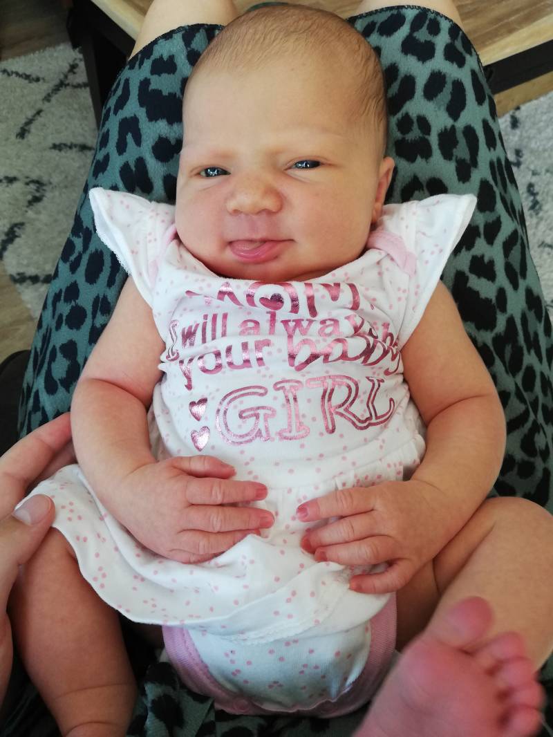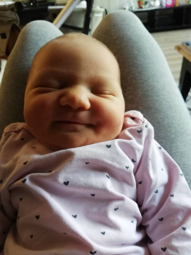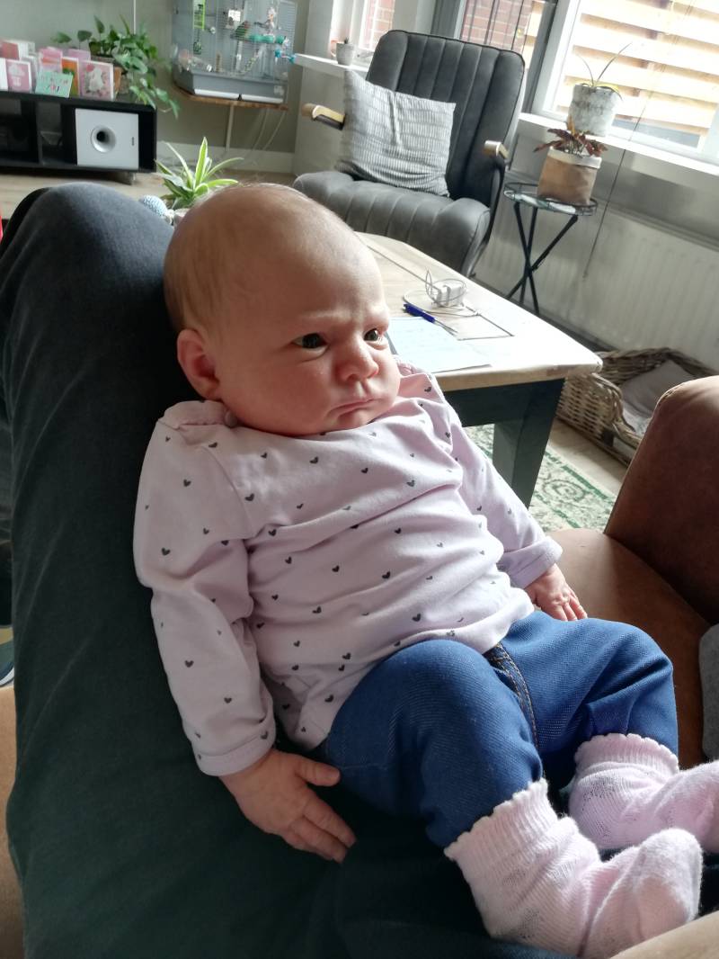 Nooit geweten of bij stil gestaan dat een kleintje ZO VEEL herrie kan maken in de nacht zeg! De hele nacht huilen kon ik me nog wel bedenken, maar dat doet ze niet. Ze kreunt en bromt alsof er een vent op onze kamer in dat wiegje ligt. De gekste geluiden komen er uit en vooral heel veel geluid. Af en toe denk je wat gebeurd daar?! Maar zij ligt gewoon heerlijk te slapen.π€ We hadden even nodig om er aan te wennen en het lijkt ook al iets minder te zijn geworden. Deze week was Jim al de hele week weer aan het werk en dat was wel even gek voor mij en ook wel zwaar. Zwaar om een ritme te vinden in slaap en voeding, ritme wat zo een kleintje nog niet heeft en ze krijgt borstvoeding op verzoek. Maar ook voor mezelf met het langzaam weer dingen in huis doen tussen de voedingen etc door, einde van de middag doet me lijf wel nog pijn van de moeheid. Nu einde van deze week slaapt ze wel elke dag al op haar eigen kamertje tussen de middag wat gewoon goed gaat, ze komt zelf ongeveer om de 3 uur voor borstvoeding en snachts hoeven we er maar 2 keer uit. Dat gaat super goed dus π